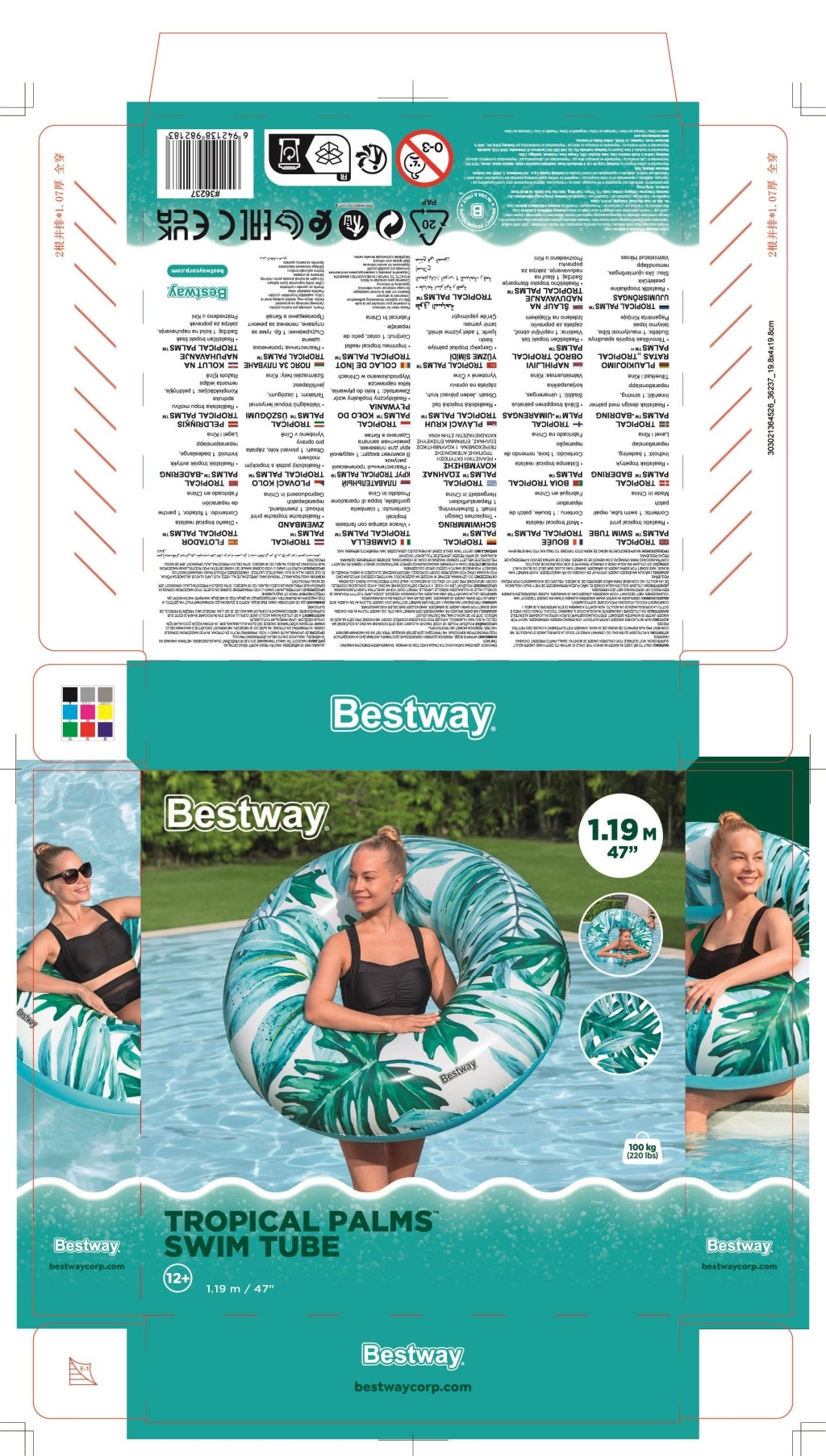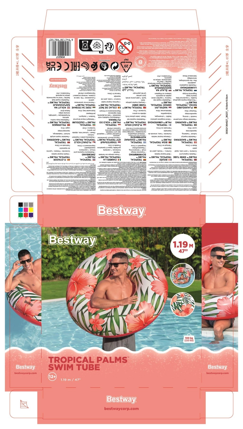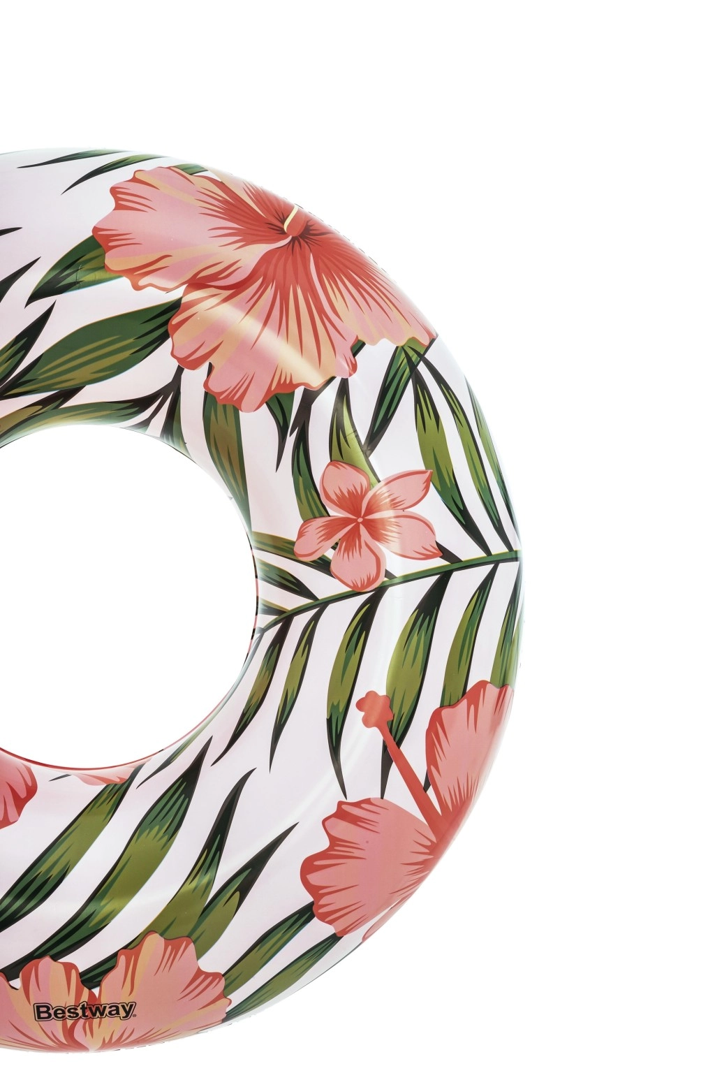 Enjoy summer with the BESTWAY swim ring, 119 cm in diameter, featuring a modern tropical design. Made from durable PVC, suitable for kids 12+ and adults. Easy to inflate and deflate, features a safety valve, and is ideal for relaxing or playing in the water at the pool, beach, or lake.
