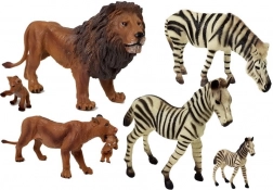 7 figurines (lion, lioness, 2 lion cubs, 2 adult zebras, 1 zebra foal)