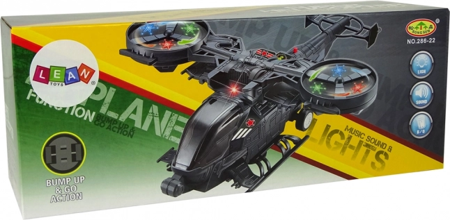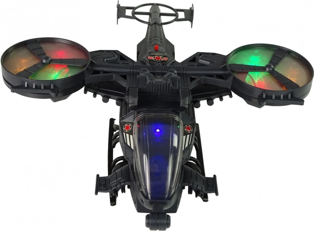 The helicopter has large rotating propellers that light up in various colors and are complemented by sound effects imitating start-up and shooting. Thanks to the wheels located on the underside, the helicopter can move on the ground.