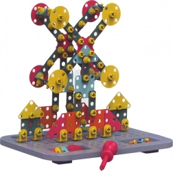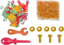 This rich STEM set supports learning through play—children will grasp the basics of technology, engineering, and math while designing their own models. Thanks to the safe battery-powered cordless screwdriver, work is smooth and fun without the need for a power outlet. Flat parts and the construction board make it possible to create colorful patterns and simple mechanisms.