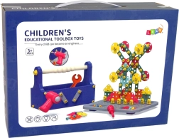 Box contents: tool case for assembly, battery-powered cordless screwdriver, construction board, flat wrench, screwdriver, large set of nuts and bolts, flat parts in geometric shapes.