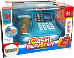 A fun kids' cash register in blue with a scale, scanner, and card reader turns every day into a realistic shop role-play. It supports learning to count, money recognition, and communication development. The scanner makes realistic sounds like in a supermarket, and the set also includes coins and a box of cookies for an even more authentic experience.