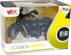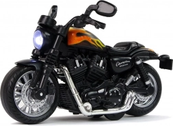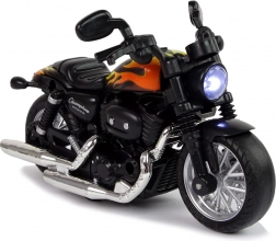 This motorcycle is highly detailed, featuring rubber tires for excellent grip and plastic elements with stickers. The pull-back drive enables easy movement when pulled back and released. Pressing down on the surface activates light and sound effects, creating the realistic feel of a ride.