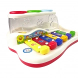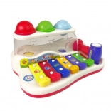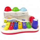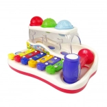 This colorful children’s xylophone combines a musical toy with a fun ball track. The brightly colored keys produce pleasant tones when tapped, helping kids playfully learn to distinguish sounds, rhythm, and simple melodies. The colorful balls can be tapped in with the hammer and watched as they travel along their path, exiting from the side of the toy — motivating further play and training hand–eye coordination.