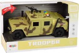 Created for little soldiers who admire military technology. This military vehicle boasts a broad body and realistic design that includes a rooftop gun mimicking a real military car. Bring the game to life with sound effects, including a horn, shooting, and engine starting, accompanied by front lights, enhancing the game's authenticity.