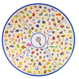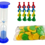 A player places their card in the middle of the play area so everyone can see what’s on it. They flip the sand timer to start the round. The player must find the images from the card on the game board as quickly as possible and mark them with their pawns. The round ends when time runs out or all images are found. For each image, they receive one token. Now it’s the next person’s turn.