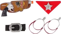 Rifle, revolver, holster, belt, sheriff's badge, bandana, spurs