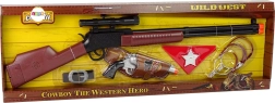 Get ready for an adventure in the Wild West. This kids' cowboy set turns little heroes into a sheriff who keeps the peace. The large rifle with sights and the compact revolver produce realistic gunshot sounds, making play even more fun—yet safe thanks to the bright orange tip and the lightweight construction made of durable plastic.