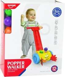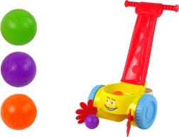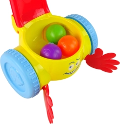 This colorful push-along cart with a smiling face motivates children to walk and play actively. A child drops a ball into the opening in the handle, the push toy spins it, and the ball pops onto the floor — ready to collect again! The game naturally develops gross and fine motor skills, hand–eye coordination, and solving simple tasks.