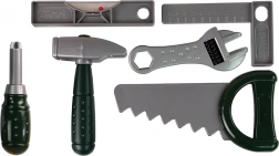 The set includes: drill, hammer, saw, wrench, screws, nuts, and a wooden board for screwing together components. All tools are made of safe plastic, suitable for children 3 years and older.