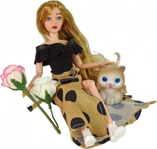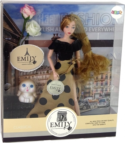 Emily is dressed in an elegant black blouse and a long beige polka-dot skirt. She has long hair ideal for brushing and hairstyling, a realistically painted face with blue eyes, and is fully poseable thanks to her joints. The set also includes a cute kitten and decorative roses to enrich everyday stories and family role-play.