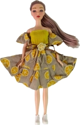 Emily has long hair, a beautiful citrus-pattern dress, and white shoes. Articulated limbs allow natural poses.