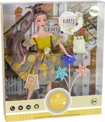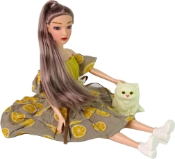 Discover a magical set for creative play – the Emily doll with three pinwheels and an adorable kitten. Encourages imagination, social skills, and offers endless fun. The doll has articulated limbs, long hair, and a citrus-pattern dress; the kitten makes a squeaky sound when pressed.