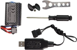 Boat, controller, battery, USB cable, anti-collision cover, screw, wrench, screwdriver, stand, manual
