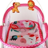 The toy arch with figures like a giraffe and lion stimulates senses and encourages child activity.
