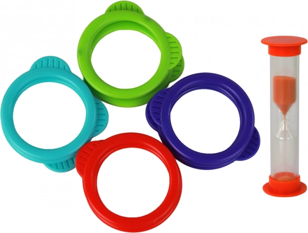 The set includes rings in four colors and an hourglass for quick competitive rounds. Set the time and try to land as many rings as possible before the sand runs out.