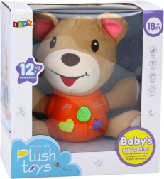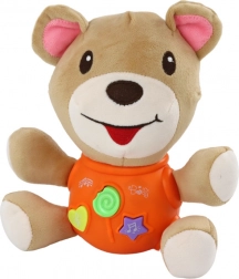 Adorable interactive plush teddy bear in orange, 23 cm tall, delights with a soft touch and smart features. On its tummy are three buttons with nature sounds, English nursery rhymes, and 5 cheerful melodies that stimulate the senses and bring lots of fun. Ideal for children from 18 months, powered by 2× AA (not included).