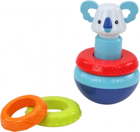 Colorful rings and a balancing koala head encourage repeated stacking. Children develop coordination, grip, and color recognition through playful activity.