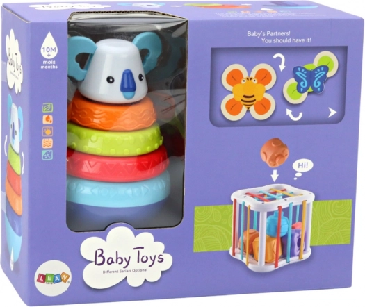 Discover a versatile sensory set for little ones that develops fine motor skills, sensory perception, and logical thinking. The set includes a koala stacking tower, an educational sensory cube with elastic bands, and 2 suction-cup spinners for fun at home or on the go. Certified CE, compliant with EN71, suitable from 10 months.