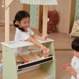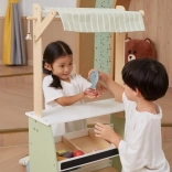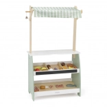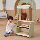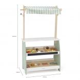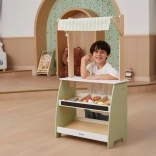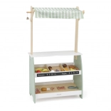 Wooden Play Stand by the brand Viga will bring a higher level of fun to your children's game of playing shop. Made from solid wood and painted in pastel shades of green, this stand will enchant not only with its appearance but also its functionality. Two shelves, a fabric awning, and a small bell make it an ideal corner for imaginative play.