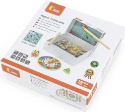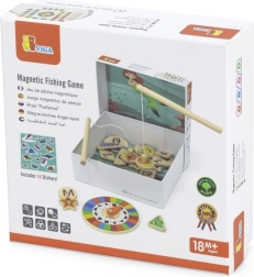 A fun and educational wooden magnetic fishing game from VIGA that includes 26 magnetic fish with letters, 2 rods, and a spinner to choose your catch. It develops hand–eye coordination, color and shape recognition, and offers lots of fun with non-toxic paints from 18 months.