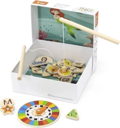 The set includes 2 magnetic rods, 26 colorful fish, and a spinner that determines the color or shape of the catch. Perfect for solo play or a two-player competition.