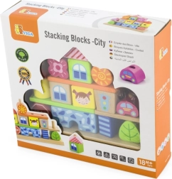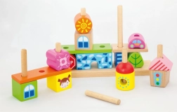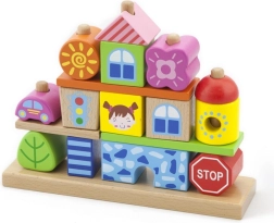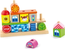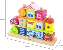 This playful set turns a child’s room into a small city of wooden blocks. It includes 8 pegs for stable threading of pieces, 4 patterns for inspiration, and 14 different blocks with motifs of houses, trees, and traffic signs. Children can build according to the templates or create their own compositions, developing imagination and logical thinking.