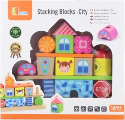 Build houses, streets, and traffic signs and create your own city stories. The blocks can be freely combined on the wooden base with pegs.