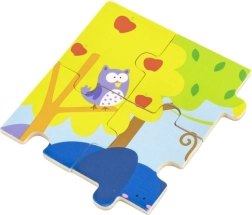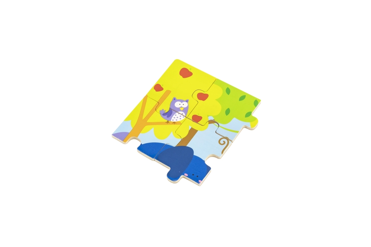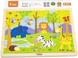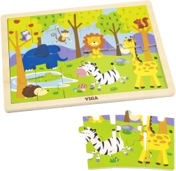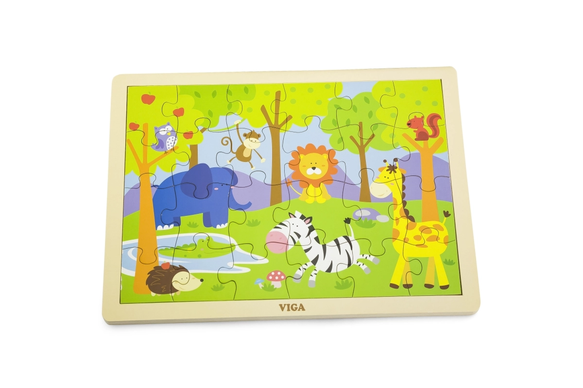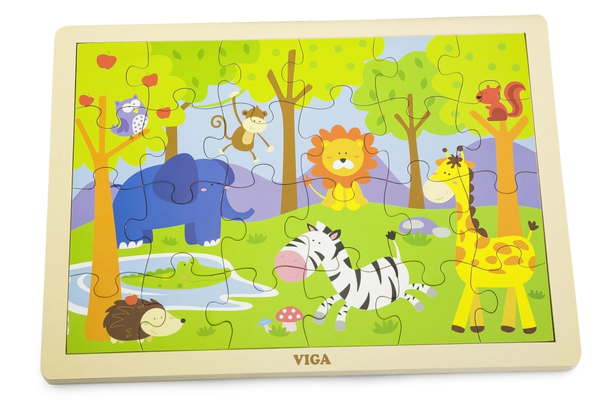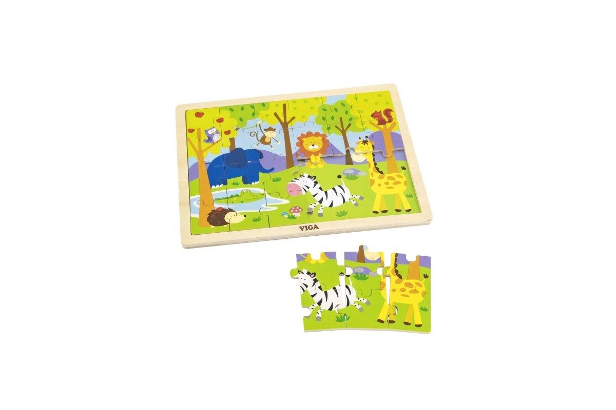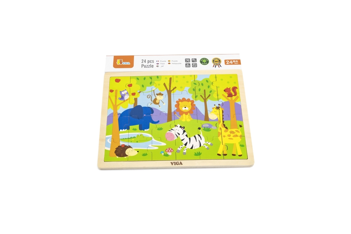 Wooden puzzle with a zoo picture. A total of 24 pieces. Picture dimensions approx. 27.5 x 20 cm. Package dimensions approx. 30 x 27 x 1 cm. Age 24m+