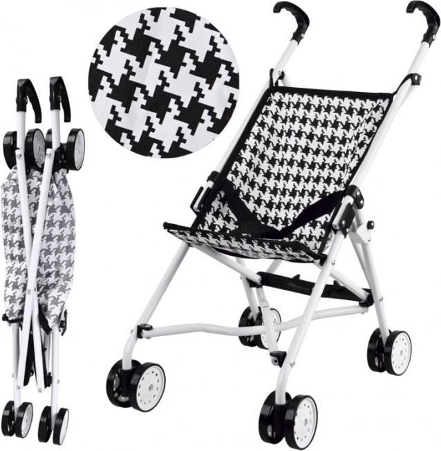 Discover a great companion for creative play — a folding doll stroller with a black-and-white houndstooth pattern. A robust metal frame, comfortable handles, and a safety belt ensure the doll is secure and the child enjoys an effortless ride. Thanks to its compact size, the stroller is easy to carry and store.