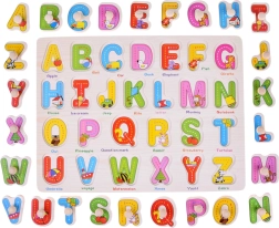 This wooden alphabet is a great helper for first encounters with letters. Large, colorful pieces with wooden knobs are easy to remove and insert, naturally developing hand–eye coordination and fine motor skills. Each letter comes with an illustration and an English word (e.g., A – Apple, B – Ball, R – Rabbit), so children learn letters and basic vocabulary at the same time.