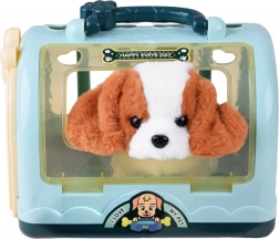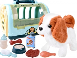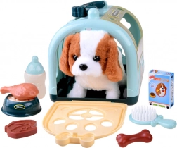 A cute set with an interactive beagle puppy brings kids hours of fun and care. It includes a soft plush toy, a practical carrier, and rich accessories for feeding and grooming. The puppy can walk forward, bark, wag its tail, and when petted on the head it makes puppy sounds. An ideal gift for little animal lovers.