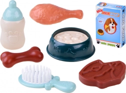 - Plush puppy, portable carrier, brush, feeding bottle, bowl with pretend food, bone, chicken drumstick, steak, box with pretend food, stickers