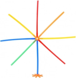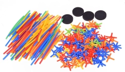 - Box contents: 122 flexible tubes (approx. 10 cm), 102 four-arm connectors, 10 six-arm connectors, 4 foam wheels (diameter approx. 3.5 cm)