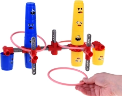 The game combines two popular games: tic tac toe and ring toss. It includes components for assembling a dynamic game that brings double the fun.
