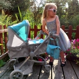 A stylish and stable 4-in-1 doll stroller that easily switches from a deep carrycot to a sport stroller. It offers an adjustable handle (to fit different child heights), a folding canopy, seat belts, swivel front wheels for easy steering, and a spacious basket plus a detachable accessory bag. The lightweight frame ensures easy handling and a realistic play experience.