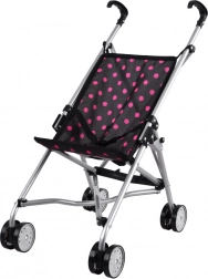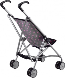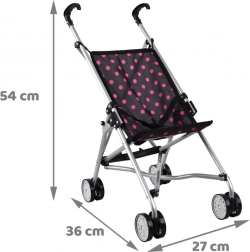 A lightweight, compact doll stroller in black with pink polka dots will delight every child. Thanks to its sturdy metal frame, comfortable handles, and double wheels for smooth riding, it’s easy to steer and safe for everyday play.