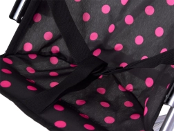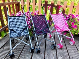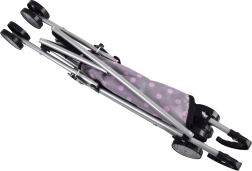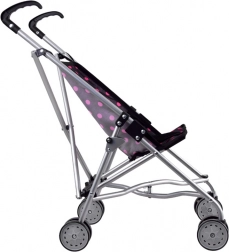 The fabric seat in a modern black design with pink polka dots is durable and pleasant to the touch. Double wheels ensure a smooth ride and good maneuverability on different surfaces. Safe folding/unfolding mechanisms and seat straps help keep the doll in place.