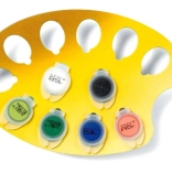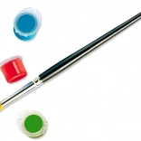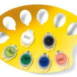 The package includes a numbered template, acrylic paints, a double brush, and a glossy varnish for the final finish.