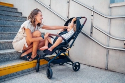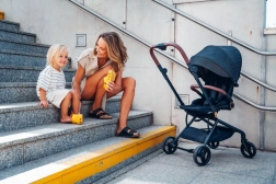 A lightweight and compact MoMi Adelle sport stroller for everyday city use and trips. It offers a 360° rotating seat for both forward- and rear-facing rides, shock-absorbing, maintenance-free EVA wheels for a smooth ride, and quick one-hand folding. Includes 5-point harness, extendable canopy, and compact dimensions when folded.