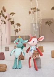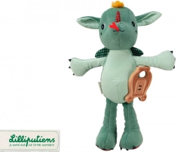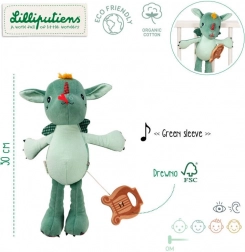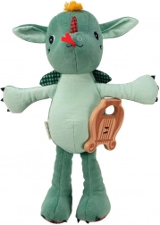 The plush dragon Joe from Lilliputiens is designed to be the perfect first friend for your child. With its height of 32 cm and wooden lyre, it serves not only as a toy but also as a musical accessory that plays the traditional melody 'Green Sleeves' when pulled. This musical dragon has small claws, checkered wings, and a cute appearance with distinctive details that encourage children's imagination.
