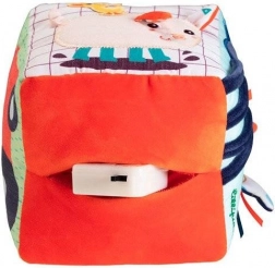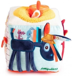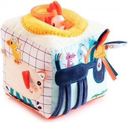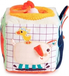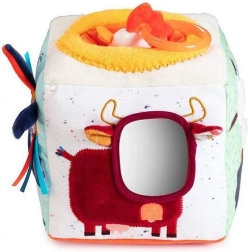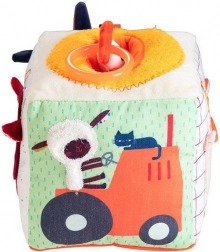 This super-soft cube is full of surprises: Rosalie the cow with a mirror, Yvon the sheep on a tractor, Gaston the duck on Simone the pig, Ignace the donkey with a lush mane of ribbons, and Paulette the hen in her soft nest. When shaken, the cube plays farm animal sounds – the child’s task is to find which hero they belong to.