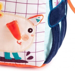 Thanks to varied textures, little pockets, and details (pulling, inserting, taking out), the toy supports fine motor skills and hand–eye coordination, while stimulating vision, hearing, and touch. The ring–teether on an elastic string soothes teething and is easy for small hands to hold.