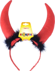 Striking maxi-size devil horns on a satin headband made of felt, adorned with soft feathers. A great accessory for a devil costume for men or women – comfortable to wear, instant impact, and a stylish look.