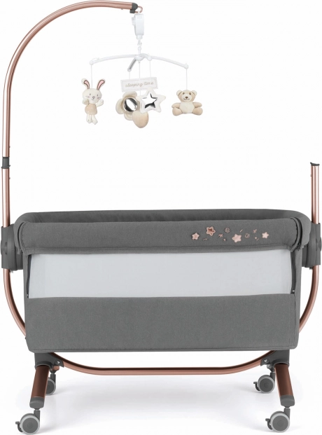 The stable metal frame with 4 wheels (2 with brakes) makes moving around the home effortless. The crib offers both fixed anchoring and gentle rocking, which soothes the baby and promotes peaceful falling asleep. Included is a musical mobile with adorable plush toys for visual stimulation and relaxation.
