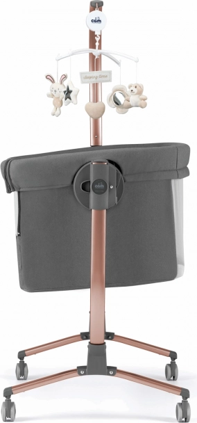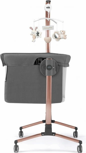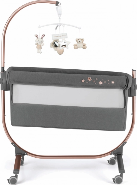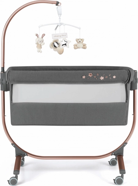 The practical Cullami bedside crib with a free musical mobile gives your baby natural closeness, safe sleep, and maximum comfort for parents. It offers 8 height levels, a 16 cm bed slide for easy bedside attachment, incline adjustment for reflux, and a rocking function for gentle swaying. A sturdy metal frame with 4 wheels (2 with brakes) and a removable side panel ensure easy moves and a secure connection to the parents’ bed.