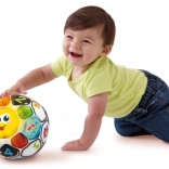 Thanks to its capabilities, the ball can roll in front of children, attracting their attention and motivating them to observe, crawl, and play. This colorful soccer ball with various textures and sound effects not only develops sensory perception but also provides tactile stimulation thanks to its soft plush cover. The light and sound effects, complemented by the glowing face and orange buttons, contribute to color recognition.