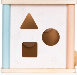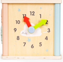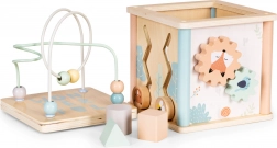 Multifunctional ECOTOYS wooden activity cube brings kids fun and learning in one. It offers a bead maze, rotating gears, clock with movable hands, and a shape sorter with colorful blocks. It develops fine motor skills, hand–eye coordination, color and shape recognition, and supports independent play. Safe design and pleasant pastel colors delight children and parents alike.