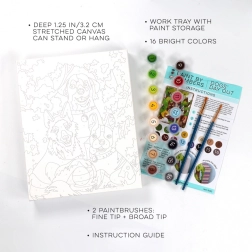 The box includes everything you need: a deep-stretched canvas (8 × 10 inches), 16 acrylic paints in pots, 2 brushes, and a simple guide. Just open the box and start painting.