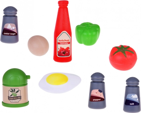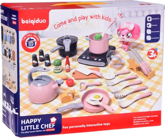 The set includes everything a little chef needs: a cooker, tableware, kitchen utensils, and even food items and seasonings.